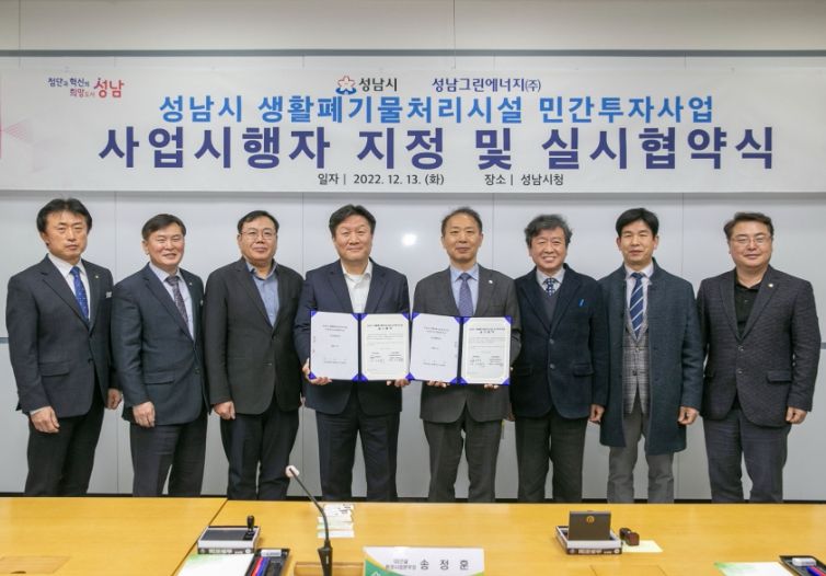 시는 12월 13일 오후 5시 시청 2층 부시장실에서 장영근 성남부시장과 사업시행자인 성남그린에너지㈜ 측 관계자 등이 참석한 가운데 ‘생활폐기물처리시설 민간투자사업 시행자 지정 및 실시협약’을 했다.