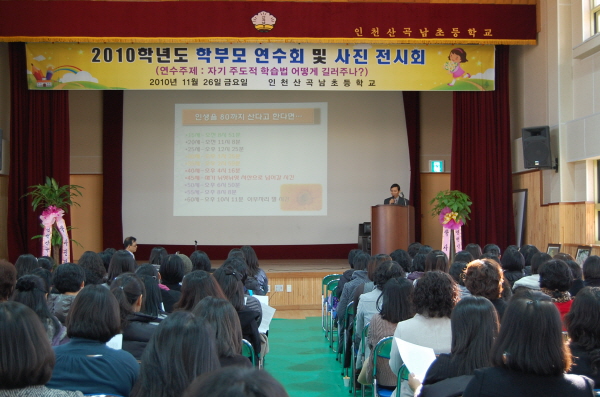 인천산곡남초등학교 이광정 교장(63)이 26일, 내년 2월에 있을 정년 퇴임식을 앞두고 ‘학부모 연수회 및 사진전시회’를 가졌다