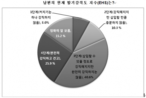 남편의 발기부전 및 발기강직도와 관련한 문항에선 전체 응답자 가운데 59%에 달하는 중년 여성들은 남편의 발기강직도를 음경이 완전히 강직해지는 4단계에 이르지 못하는 것으로 느낀다고 답했다. 이 가운데 남편의 발기강직도가 3단계에 해당된다고 응답한 여성의 비율이 가장 높았는데, 3단계 발기강직도의 경우 발기부전으로 인지하지 못해 방치하는 경우가 많아 발기부전 치료의 사각지대로 분류되고 있다.