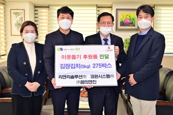 차준택 구청장은 “따뜻한 이웃사랑을 몸소 실천해준 리엔리솔루션㈜과 코윈시스템㈜, ㈜꿈의엔진에 감사하다”며 “전달받은 김장김치는 지역 내 어려운 이웃에게 잘 전달하겠다”고 말했다.