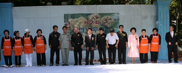 뒤이어 박승숙 구청장, 김환 의장, 한광원 전 국회의원의 축사와 치사와 함께 어린이 10여명과 함께 밤송이가 주렁주렁 열린 행사장 뒤편에서 ‘밤따기 시연’ 행사를 가졌다