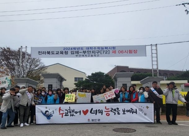 2024년 대학수학능력시험 부안군 응시자는 총 311명으로 부안고등학교에서 149명, 부안여자고등학교에서 162명이 시험을 치뤘다. 이날을 위해 열심히 달려온 수험생들에게 좋은 결과가 있기를 바라고 그동안 흘린 땀방울과 노고에 큰 박수를 보낸다며 수험생들 위해 정성껏 준비한 핫팩과 간단 식품 전달하며 밝은 미소로 수험생과 청소년들에게 힘을 복돋주었다.