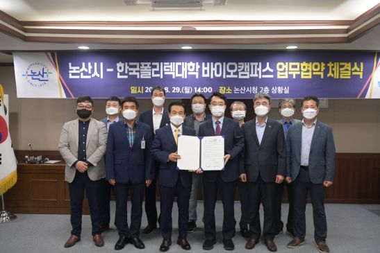 논산시는 29일 시청 2층 상황실에서 ‘논산시-한국폴리텍대학 바이오캠퍼스 업무협약’을 체결하고, 상생협력을 통한 바이오 기술 및 식품 연구개발에 힘을 모을 것을 약속했다.