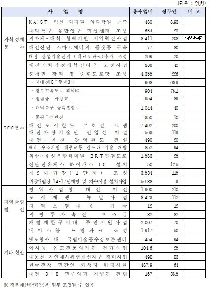 이 밖에 주요 현안사업인 ▲이사동 유교전통의례관 건립사업(25억 원) ▲한국전쟁 민간인 희생자 위령시설(64억 원) ▲대전 3·8 민주의거 기념관 건립(38억 원) ▲대전교통약자이동지원센터 운영(110억 원) 등이 이번 정부안에 포함됐다.
