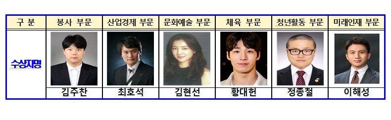 각 부문별 수상자는 ▲김주찬(봉사) ▲최호석(산업경제) ▲김현선(문화・예술 부문) ▲황대헌(체육) ▲정종철(청년활동) ▲이해성(미래인재)씨 등 6명이다.