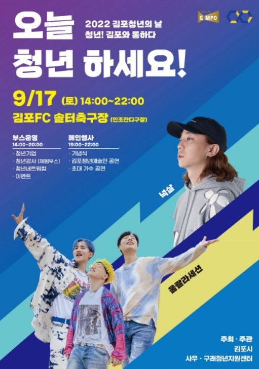 9월 17일 김포FC 솔터구장 인조잔디구장에서 열리는 ‘김포 청년의 날 행사’는 청년 단체와 기업 홍보 및 다양한 체험 이벤트가 펼쳐지고 오후 7시 개최되는 기념식에서는 김포 시민과 청년들이 청년의 날을 기념하며, 김포 청년 예술인과 넉살, 울랄라 세션의 공연이 있을 예정이다.