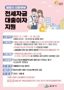 박일호 밀양시장은 “전세자금 대출이자 지원 사업 시행으로 신혼부부들의 주거비 부담을 줄여주고, 나아가 안정된 주거여건 마련과 인구증가에도 도움을 줄 것으로 기대한다”라고 말했다.