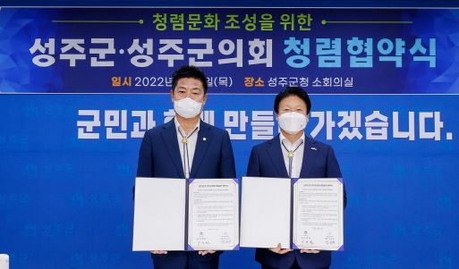 [한국기자연대] 성주군은 성주군의회와 '반부패·청렴주간'을 맞이하여 1일 군청 소회의실에서 “청렴협약식”을 개최하고 군과 의회 지도부의 청렴의지를 공고히 했다.