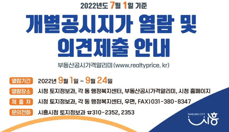 개별공시지의 열람은 ‘부동산공시가격알리미’ 및 시흥시 누리집에서 확인할 수 있다.