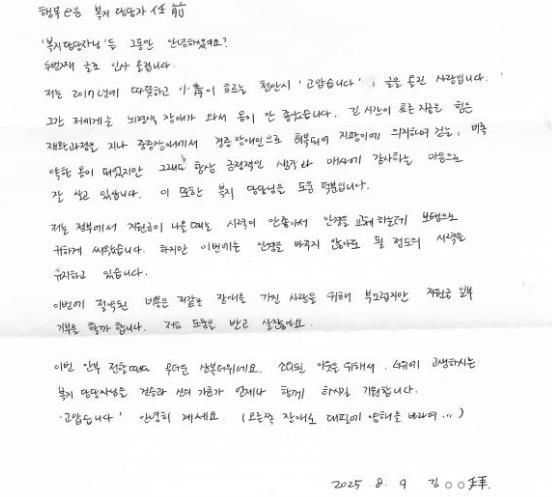 [한국기자연대] 홀로 사는 70대 어르신이 천안시에 시 복지 정책에 대한 감사의 뜻을 담은 편지와 함께 취약계층을 위한 후원금을 전달해 눈길을 끌고 있다.