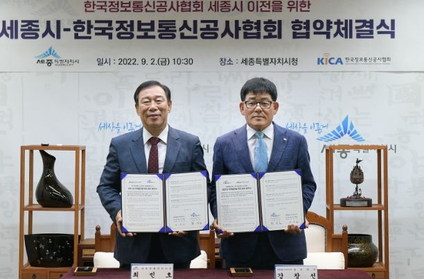 세종특별자치시는 2일 세종시청 접견실에서 최민호 시장과 강창선 한국정보통신공사협회 중앙회장이 참석한 가운데 ‘한국정보통신공사협회 세종시 이전 업무협약’을 체결했다고 밝혔다.