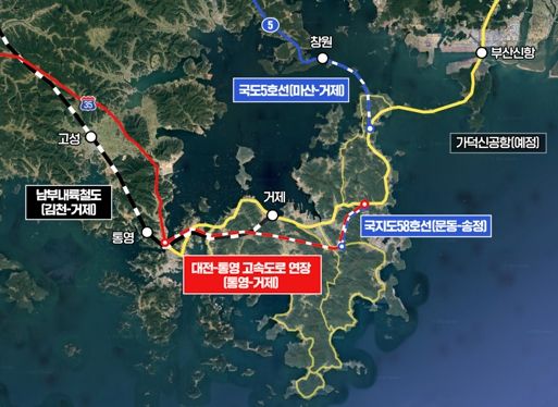 거가대교 통행료 인하 추진과 투트랙으로 지방도인 거가대로를 정부가 관리하는 국도로 승격해 요금을 국가 재정도로 수준으로 낮춘다는 복안이다. 이와 더불어 현재 추진 중인 통영~대전 고속도로(35호선)의 거제 연장 노선을 가덕도신공항까지 확장, ‘통영~거제~가덕도신공항 고속도로 건설’을 가덕도신공항 기본계획에 반영함으로써 광역교통망을 완성해 내겠다는 구상이다.