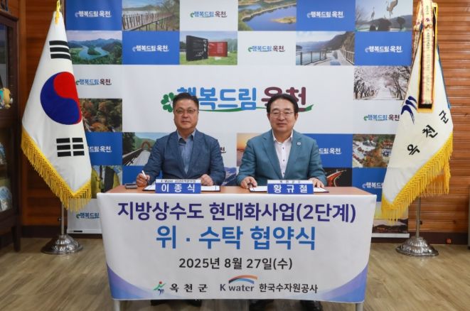 [한국기자연대] 옥천군이 지난 27일 군청 군수실에서 한국수자원공사 금강유역본부와 함께 ‘지방상수도 현대화사업(2단계) 위수탁 협약’을 체결했다.