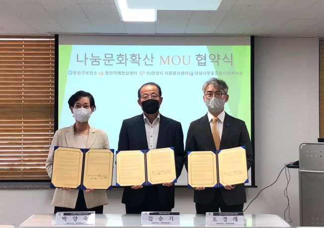 동안치매안심센터(센터장 김순기)가 부흥종합사회복지관(관장 조경래), 안양시 자원봉사센터(센터장 박양숙)와 각각 맺은 이번 협약은 △치매 교육 프로그램 운영 파트너십△치매 사업 자원봉사 파트너십의 내용을 주요 골자로 한다.