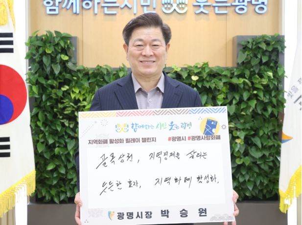 박승원 광명시장은 이날 ‘골목상권과 지역경제를 살리는 든든한 효자, 지역화폐 활성화’ 문구와 함께 챌린지 동참 인증 사진을 개인 SNS에 올리며, “전통시장과 골목상권, 지역경제를 살리는 데 톡톡히 역할을 하고 있는 지역화폐에 대한 지원은 멈추면 안 된다”고 호소했다.