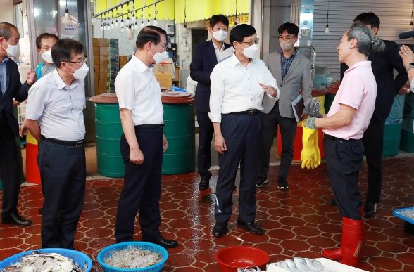 [한국기자연대] 전형식 충남도 정무부지사는 8일 송상근 해양수산부 차관 등과 함께 홍성 광천전통시장에서 진행 중인 추석 맞이 ‘2022 대한민국 수산대전 전통시장 온누리 상품권 환급 행사’ 현장을 찾아 민생을 살폈다.