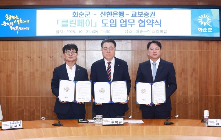 [한국기자연대] 화순군은 공정한 계약 문화 정착과 원활한 대금·임금 지급을 위해 신한은행, 교보증권과 차세대 전자적대금지급 시스템인 ‘클린페이’ 도입을 위한 업무협약을 체결했다고 밝혔다.