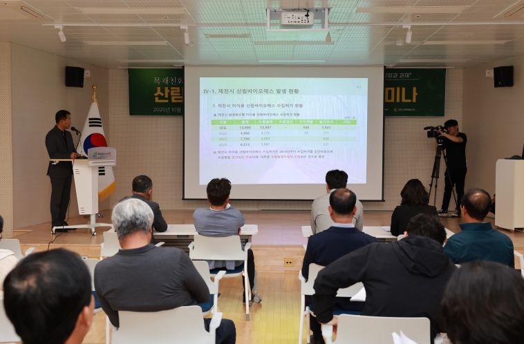 세미나에서는 먼저 백두현 제천시 산림과장이 ‘제천시 산림현황 및 산림경영 발전방향’을 발표하며 지역 산림의 지속가능한 관리 방안과 정책적 지원 필요성을 강조했다. 이어 국산목재협동조합 김지훈 이사장이 ‘제천시 목재산업 현황과 과제’를 주제로 지역 목재산업의 성장 여건과 현실적 문제점을 짚었다.