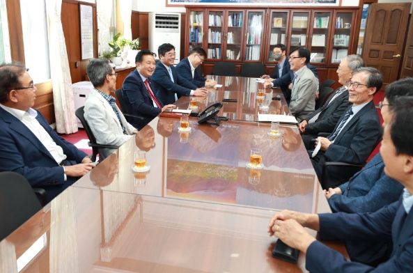[한국기자연대] 김영환 도지사는 14일 유희열 전 과기부 차관 등 과기부 고위공무원 출신 8명을 초청해 여는마당에서 간담회를 갖고 카이스트 오송캠퍼스 건립 등 과학기술 분야 도정 현안에 대해 지원을 당부했다.