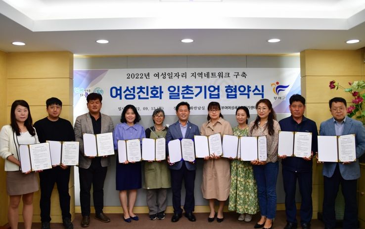 [한국기자연대] 부여군이 여성이 일하기 좋은 기업환경 조성을 위해 지난 15일 여성친화 일촌기업 협약식을 개최했다.