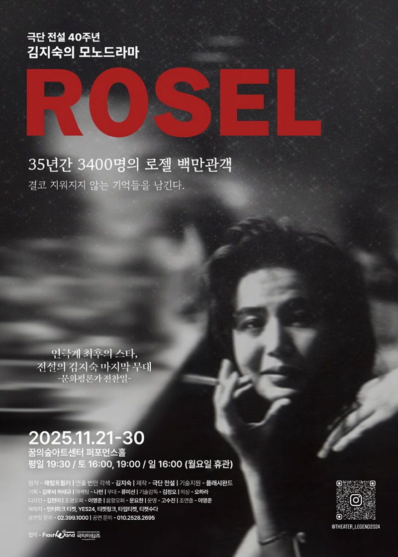 [한국기자연대] 극단 전설 40주년 기념작이자 배우 김지숙의 마지막 공연인 모노드라마 〈로젤〉이 오는 11월 21일부터 30일까지 꿈의숲아트센터 퍼포먼스홀에서 막을 올린다. 35년간 3,400회 이상 공연되며 백만 명이 넘는 관객을 울린 이 작품은 여성의 주체성과 인간성의 회복을 그린 한국 연극사의 대표작으로 꼽힌다.