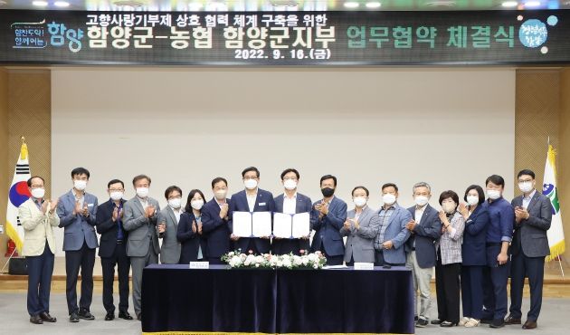 진병영 함양군수와 최윤만 농협중앙회 함양군지부장 및 관내 농⋅축협 조합장 등 20여명이 참석한 가운데 열린 이날 업무협약은 2023년 1월 1일부터 시행되는 고향사랑기부제의 효율적인 운영을 위해 상호 협력 체계 구축과 발전방향을 논의하기 위해 마련됐다.