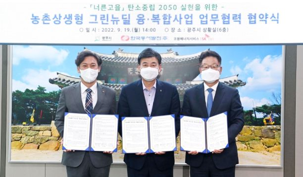 [한국기자연대] 광주시는 19일 시청 상황실에서 한국동서발전㈜, 코원에너지서비스㈜와 함께 ‘농촌 상생형 그린뉴딜 융·복합사업 추진을 위한 업무협약’을 체결했다.