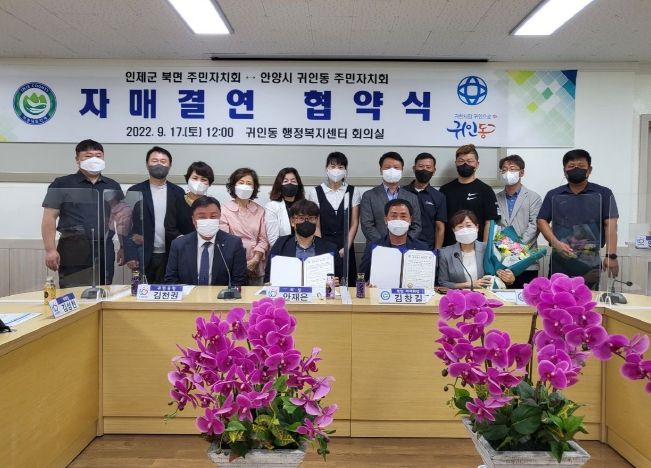 [한국기자연대] 안양시 귀인동 주민자치회(회장 안재은)는 지난 17일 귀인동 행정복지센터에서 강원도 인제군 북면 주민자치회와 만나‘상호 교류 및 농산물 직거래를 위한 자매결연’을 맺었다고 20일 전했다.