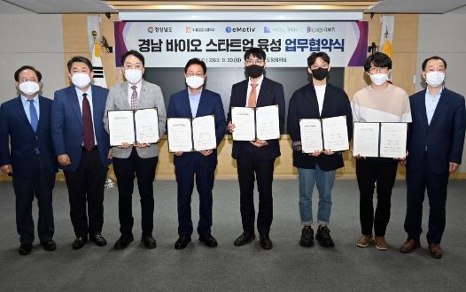 경남도는 20일 도청 도정회의실에서 대웅제약과 ㈜이모티브, ㈜하이셀텍, 디보㈜ 등 도내 기업체와 함께 바이오 스타트업에 대한 성장과 투자유치를 지원하기 위한 업무협약을 체결했다.