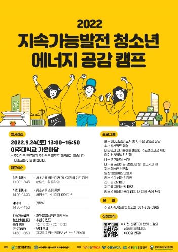 [한국기자연대] 수원시 에너지센터는 24일 오후 1시 아주대학교 가온마당에서 ‘2022 지속가능발전 청소년 에너지 공감캠프’를 연다.