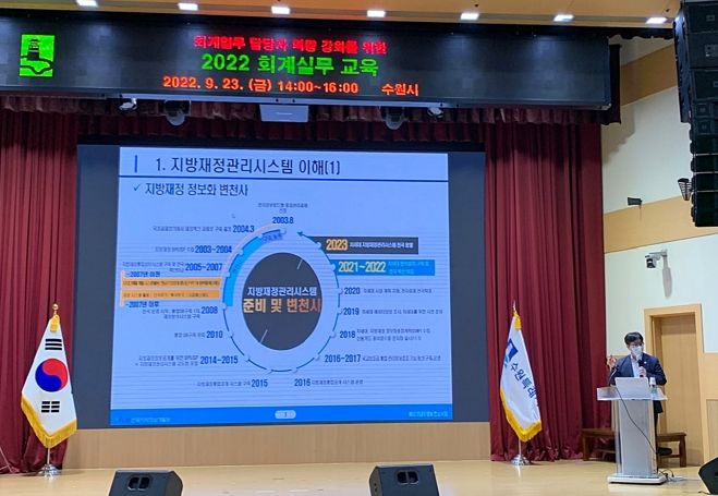 [한국기자연대] 수원시가 23일 시청 대강당에서 회계·계약 업무 담당 공직자 300여 명을 대상으로 ‘2022년 회계 및 계약 실무교육’을 열었다.