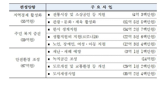 이번 추경에는 한시 생계지원 등 주민복지 증진에 가장 많은 89억원의 사업비를 편성하고, 이어 지역경제 활성화 55억원, 도로 및 교통환경 개선 등 안전한 생활환경 조성에 67억원을 편성했다.
