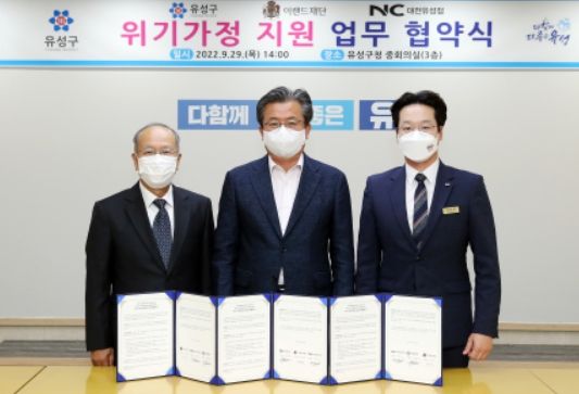 [한국기자연대] 대전 유성구는 29일 이랜드재단, NC대전유성점과 유성구의 위기가정을 지원하고 지역사회 돌봄 공동체를 구축하기 위한 업무 협약을 체결했다고 전했다.