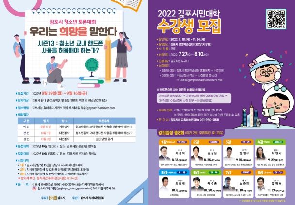 김포시는 30일 “김포시 청소년들과 시청의 소통 매개체인 ‘2022 청소년 토론대회’가 10월 1일 본선 개최를 시작해 그달 8일 결선을 예고하고 있다”고 밝혔다.