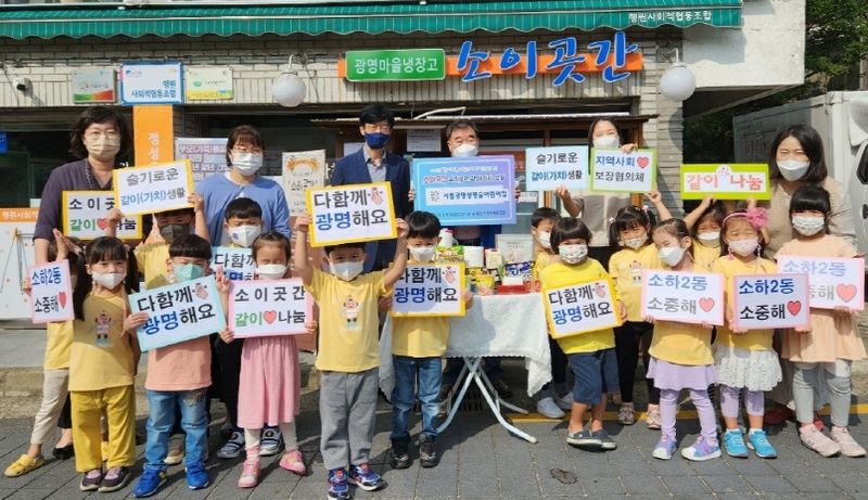 [한국기자연대] 광명시 소하2동 지역사회보장협의체가 운영하는 소이곳간 ‘슬기로운 같이(가치)생활 사업’에 광명생명숲 어린이집이 여덟 번째 기관으로 참여해 지난 29일 어린이집 지도교사 및 원생 80여 명이 물품 전달식을 가졌다.