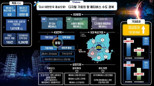 이러한 기본계획 추진을 통해 경북도는 2026년까지 ▷메타버스 육성 거점 5곳 구축 ▷R&D 콘텐츠 150건 개발 ▷마케팅․인증․실증 등 기업 1,615개社 지원 ▷크리에이터 등 인력 6260명 양성 ▷가상도민(메타인구) 1000만 명 유치를 목표로 하고 있다.