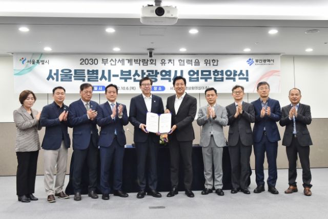 부산시는 6일 오전 10시 10분 서울시청 영상회의실에서 서울시(시장 오세훈)와 '2030부산세계박람회 유치지원 협력을 위한 업무협약(MOU)'을 체결했다고 밝혔다.