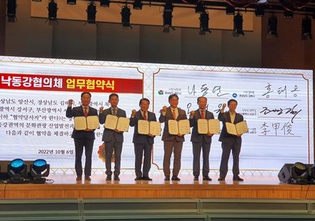6일 오전 양산비즈니스센터 5층 컨벤션홀에서 조병길 사상구청장, 오태원 북구청장, 김형찬 강서구청장, 이갑준 사하구청장, 나동연 양산시장, 홍태용 김해시장이 참석한 가운데 가칭‘낙동강협의체’협약식을 열고 낙동강 권역 문화관광자원화사업과 공동문제 해결 등을 주요 내용으로 하는 협약서에 서명을 하며 공동 발전을 위한 의지를 다졌다.