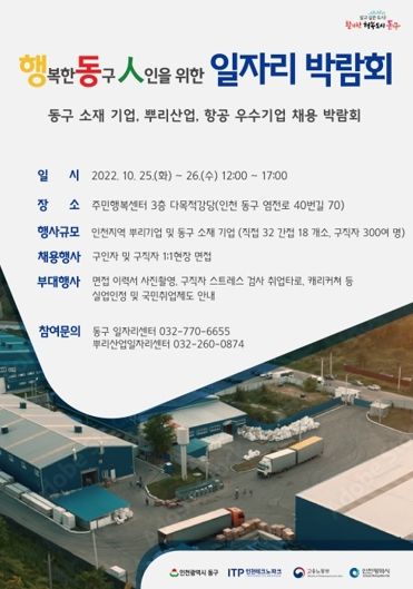 [한국기자연대] 인천 동구는 오는 25일과 26일 오후 2시 주민행복센터 3층 다목적 강당에서 동구 일자리 박람회를 개최한다.