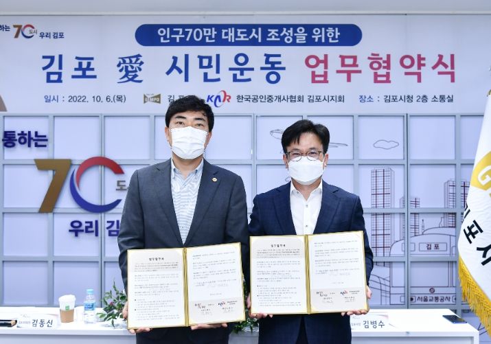 [한국기자연대] 김포시는 지난 6일 시청 소통실에서 공인중개사협회 김포시지회와 인구 70만 대도시 조성을 위한 ‘ 김포애(愛) 시민운동’ 업무협약식을 체결했음을 7일 알렸다.