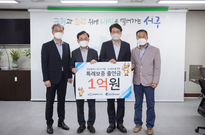 서구는 지난 7일 인천신용보증재단과 함께 전달식을 열고 소상공인 특례보증 추가 출연금 1억 원을 전달했다고 밝혔다.