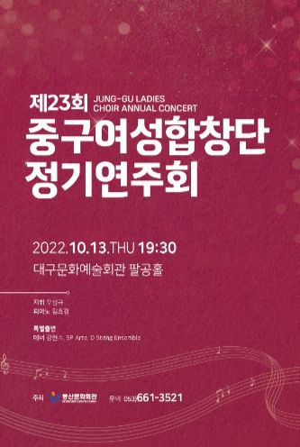 [한국기자연대] 대구광역시 중구청은 제23회 중구여성합창단 정기연주회를 13일 오후 7시30분 대구문화예술회관 팔공홀에서 개최한다.