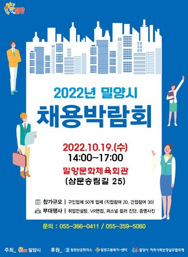[한국기자연대] 밀양시는 오는 10월 19일 삼문동 밀양문화체육회관에서 지역기업의 우수인력 채용과 시민의 일자리 지원을 위해 ‘2022년 밀양시 채용박람회’를 개최한다고 밝혔다.