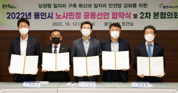 이날 회의와 협약에는 용인시노사민정협의회 위원장인 이상일 용인특례시장, 윤원균 용인특례시의회 의장, 이상원 한국노총 용인지역지부 의장, 이태열 용인상공회의소 수석부회장, 윤종문 고용노동부 경기지청 노사상생지원과장 등 5개 기관 대표가 참여했다.