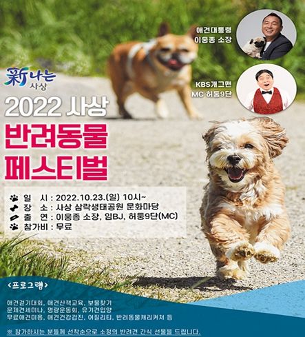 [한국기자연대] 안전하고 성숙한 반려동물 문화 조성을 위한 ‘2022 사상 반려동물 축제’가 오는 10월 23일 오전 10시부터 오후 4시까지 삼락생태공원 문화마당 일원에서 펼쳐진다.
