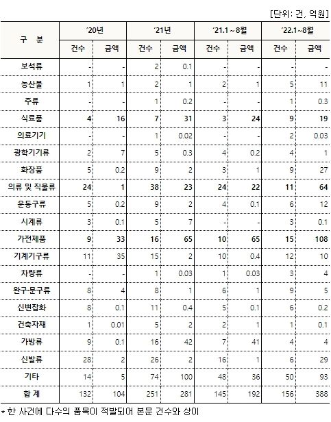 올해 8월까지 ‘개인통관고유부호 도용’ 행위를 포함한 해외직구 악용 사범 전체 적발 실적은 총 120건, 388억원 상당으로 전년 동기대비 건수는 26%, 금액은 102% 증가했고 범죄 규모도 대형화 되는 추세이다.