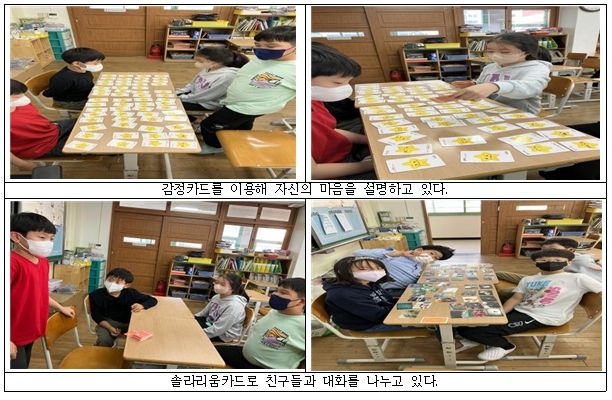 학생들은 담임선생님들과 ‘솔라리움’, ‘감정카드’를 활용하여 대화를 나누었다. 학생들은‘요즘 나의 삶을 잘 나타내고 있는 사진은?’, ‘이번에 나의 삶에서 이루어지기를 소망하는 사진은?’, ‘지금 나에게 가장 와닿는 감정카드는?’, ‘어제 내가 느낀 감정, 오늘 내가 느낀 감정, 내일 내가 느끼고 싶은 감정은?’ 등과 같은 주제로 서로 질문과 답변을 주고 받았다.