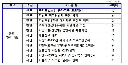 지역현안사업으로 ‘국지도82호선 금마지구 도로개선(10억 원)’, ‘지방어항(신남항) 접안시설 확충사업(12억 원)’, ‘지방도 미끄럼방지 포장사업(6억 원)’ 등이 선정됐으며, 재난안전사업으로 ‘제설창고 설치(10억 원)’, ‘산불감시 지능형 CCTV 설치(18억 원)’, ‘지방도 유지보수 사업(6억 원)’ 등이 선정됐다.