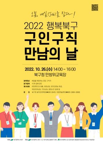 [한국기자연대] 대구 북구청은 강북고용복지+센터, 대구시여성회관과 함께 구직자의 취업기회 확대와 기업의 구인난 해소를 위해 오는 10월 26일 오후 2시부터 북구청 민방위교육장에서'2022 행복북구 구인․구직 만남의 날'행사를 개최한다.