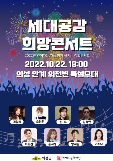 [한국기자연대] 의성군은 오는 22일 저녁 7시부터 90분간 안계 위천변 특설 무대에서 ‘세대공감 희망콘서트’가 열린다고 밝혔다.